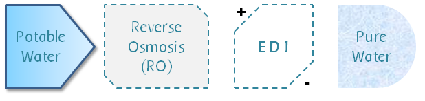 Potable water then treated to remove dissolved solids, ions to yield Purified water.